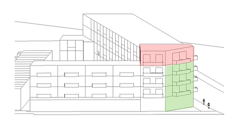 The raised section of apartments are the highest area on the block reaching a further 2m on the original design. The promotes the corner block as a central area and can be seen from many areas of the block, making the area more legible.